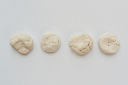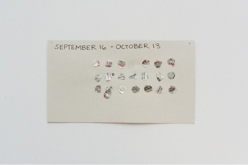 I made three series. Earring imprints — cast in cornstarch, flour, and water, labeled only with words describing how I remember each day. Bodily imprints on organic forms, deliberately unlabeled, so the shape itself becomes the only information available. And a record of my birth control and menstrual cycle — the tabs pulled from the case, the dots marking days, nothing else explained.
